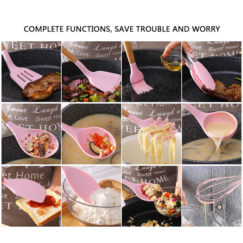 Premium Silicone Kitchen Utensils Set (With Wooden Handle) - Click Saman